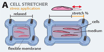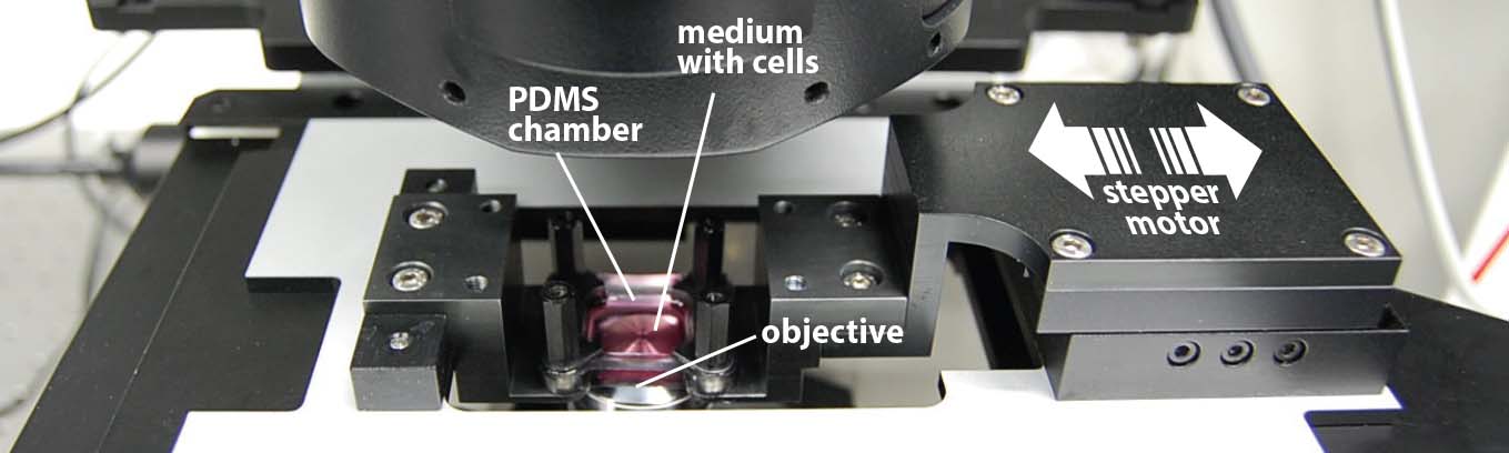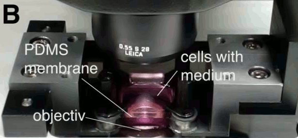 Read moreMany cell types in our body are subjected to deformation or mechanical forces. These mechanical signals play important roles in many fundamental cell functions, exert multipe effects and thereby regulating important processes. In ordert o investigate the mechanical response of cells to uniaxial stretch we use a cell stretching device wich was kindly given by the Forschungszentrum Jülich. Cells are seeded on an flexible PDMS-membrane and are stretched by a stepper motor wich is connected to one side oft the chamber.